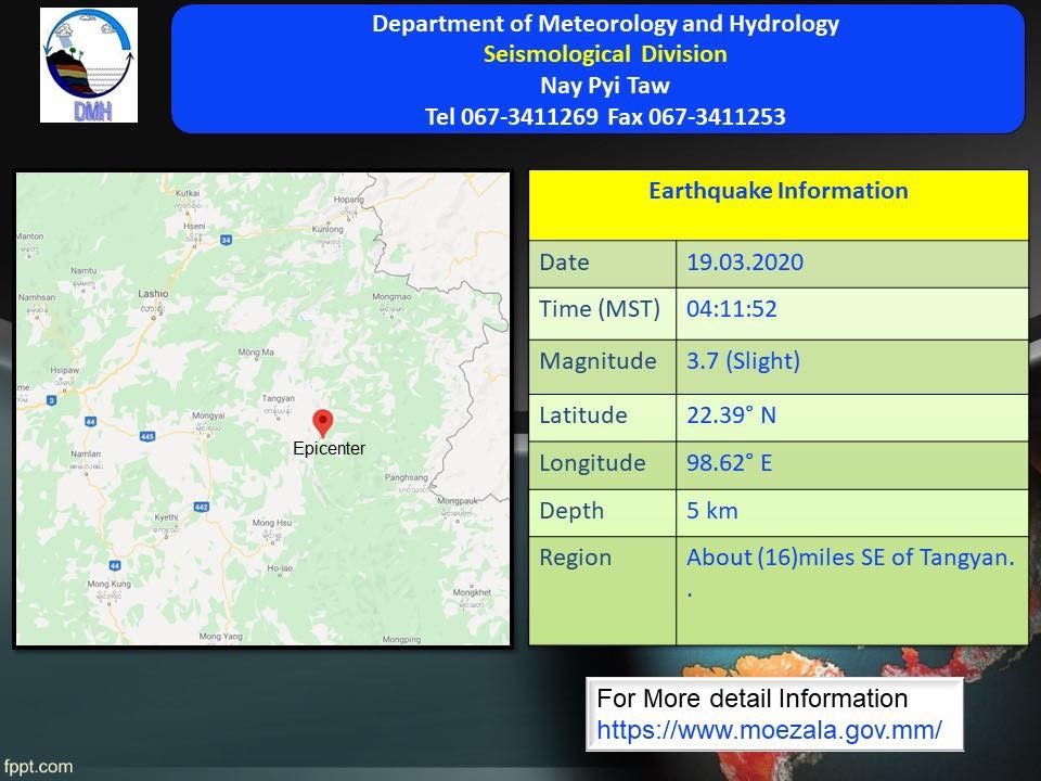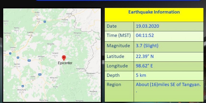 The slight earthquake in Shan State with a depth of 5 kilometers occurred at 4:11 a.m. Myanmar Standard Time.