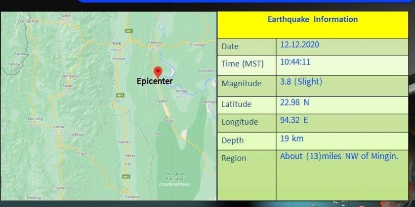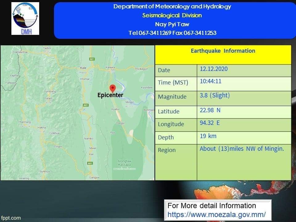 A 3.8-magnitude earthquake hit about 13 miles northwest of Mingin Township on Saturday, according to the Department of Meteorology and Hydrology.