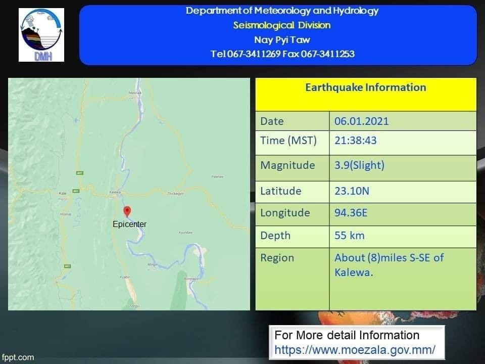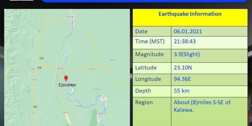 A 3.9-magnitude earthquake hit about 8 miles south-southeast of Kalewa Township on Wednesday night, according to the Department of Meteorology and Hydrology.