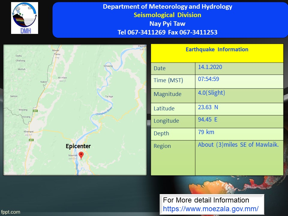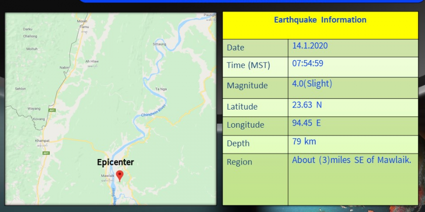 The slight earthquake in Sagaing Region with a depth of 79 kilometers occurred at 7 hrs 54 minutes 59 seconds Myanmar Standard Time.