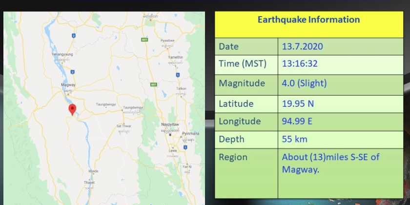The slight earthquake in Magway Region with a depth of 55 kilometers occurred at about 1:16 p.m. Myanmar Standard Time.