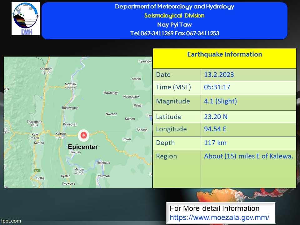 A 4.1-magnitude earthquake hit about 15 miles east of Kalewa Township on Monday, according to the Department of Meteorology and Hydrology. The slight earthquake in Sagaing Region with a depth of 117 kilometers occurred at about 5:31 am Myanmar Standard Time.