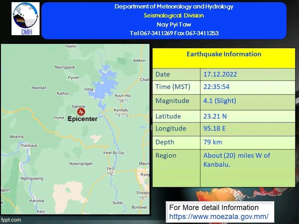 A 4.1-magnitude earthquake hit about 20 miles west of Kanbalu Township on Saturday night, according to the Department of Meteorology and Hydrology. The slight earthquake in Sagaing Region with a depth of 79 kilometers occurred at about 10:35 pm Myanmar Standard Time.