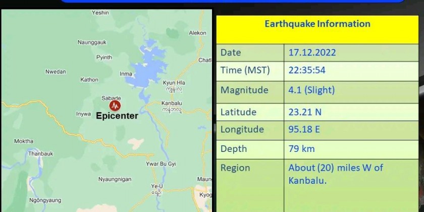 Slight Earthquake: 4.1-magnitude earthquake hit west of Kanbalu Tsp.