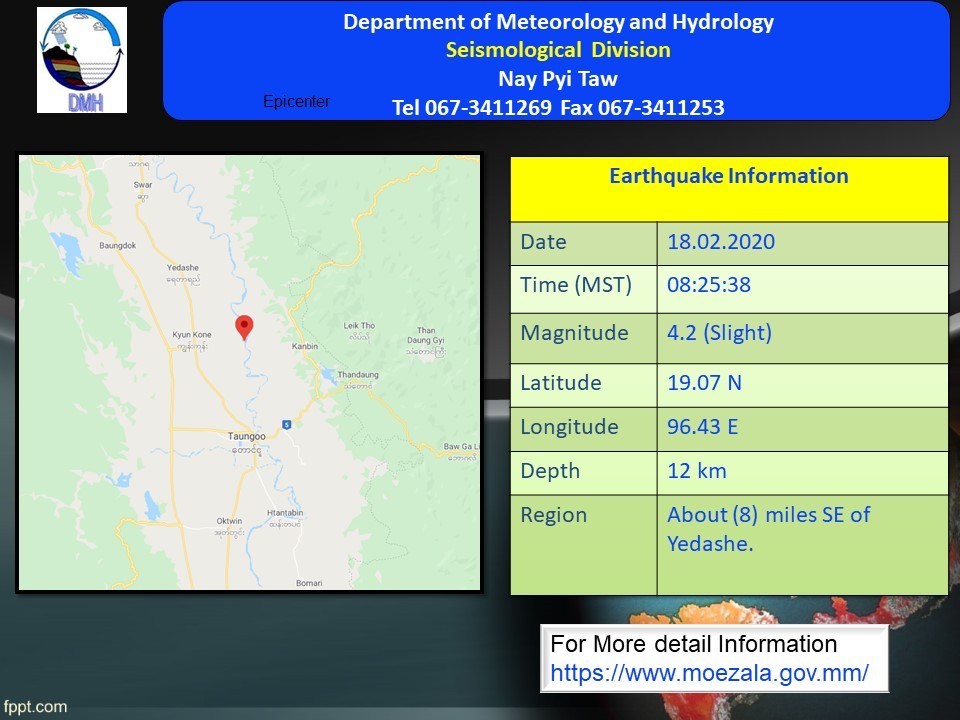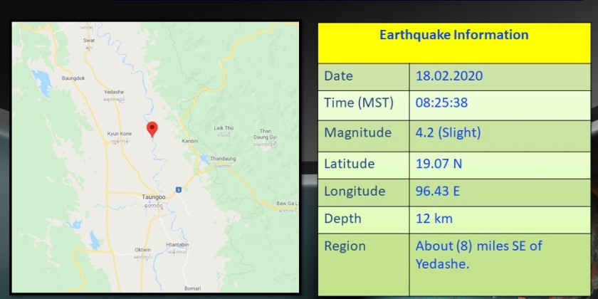A 4.2-magnitude earthquake hit with its epicenter about 8 miles southeast of Yedashe Township on Tuesday, according to the Department of Meteorology and Hydrology.