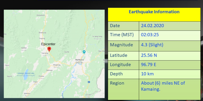 The slight earthquake in Kachin State with a depth of 10 kilometers occurred at 2:03 a.m. Myanmar Standard Time.