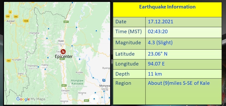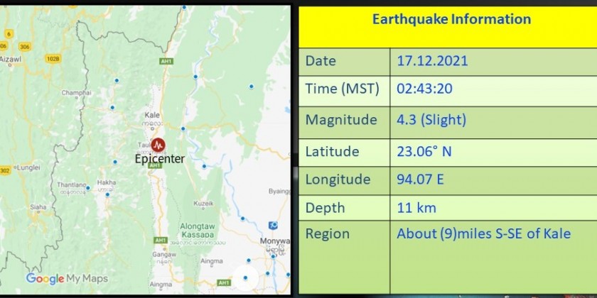 A slight earthquake hit Sagaing Region on Friday, Department of Meteorology and Hydrology reported.