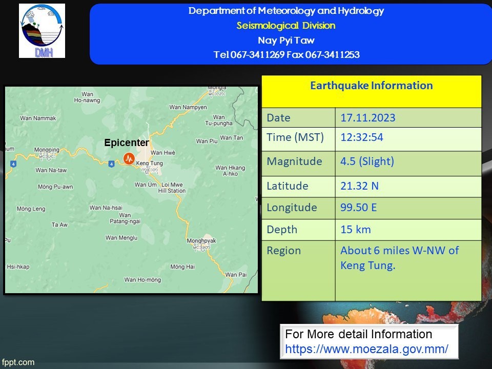 This slight earthquake in Shan State with a depth of 15 kilometers occurred at about 12:32 p.m. Myanmar Standard Time on Friday.
