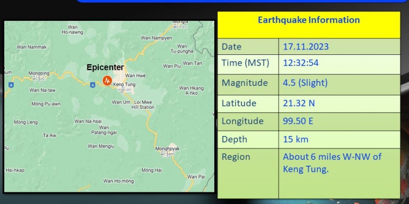 A 4.5-magnitude earthquake with its epicenter inside Myanmar hit about 6 miles west-northwest of Kengtung Township, according to the Department of Meteorology and Hydrology.