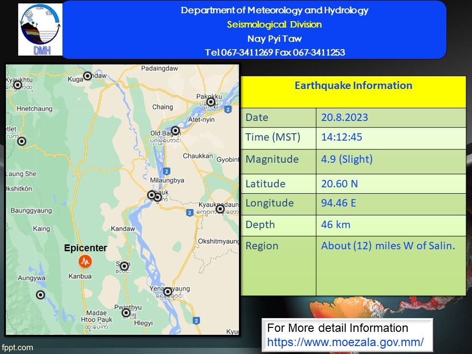 A slight earthquake of magnitude (4.9) Richter Scale with its epicenter inside Myanmar (about (12) miles west of Salin), latitude 20.60 °N, longitude 94.46 °E, depth (46) kilometers, about (51) miles southwest of Nyaung-U seismological observatory was recorded at (14) hr (12) min (45) sec Myanmar Standard Time on 20th August, 2023.