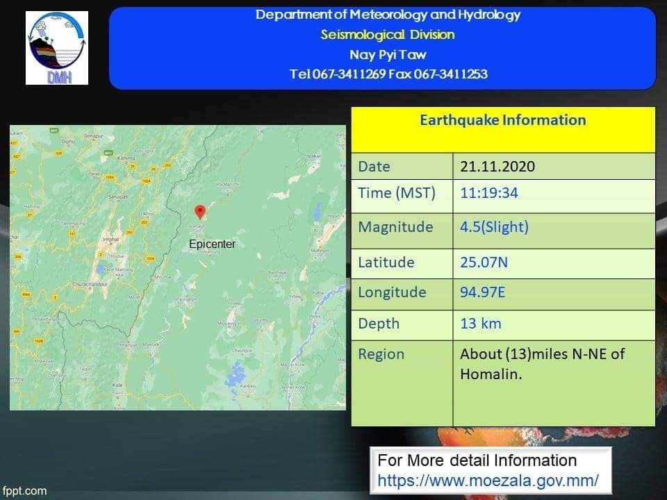 A slight earthquake of magnitude (4.5) Richter Scale with its epicenter inside Myanmar (about (13)miles north-northeast of Homalin), latitude 25.07°N, longitude 94.97°E, depth (13) kilometers, about (72)miles north-northeast of Tamu seismological observatory was recorded at (11)hr (19)min (34)sec M.S.T on 21th November, 2020.