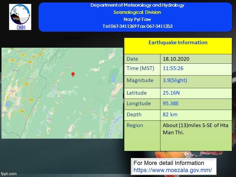 A slight earthquake of magnitude (3.9) Richter Scale with its epicenter inside Myanmar (about (13) miles south-southeast of Hta Man Thi-), latitude 25.16°N, longitude 95.38°E, depth (82) kilometers, about (91) miles northwest of Katha seismological observatory was recorded at (11) hr (55) min (26) sec Myanmar Standard Time on 18th October, 2020, according to the report of the department of Meteorology and Hydrology.