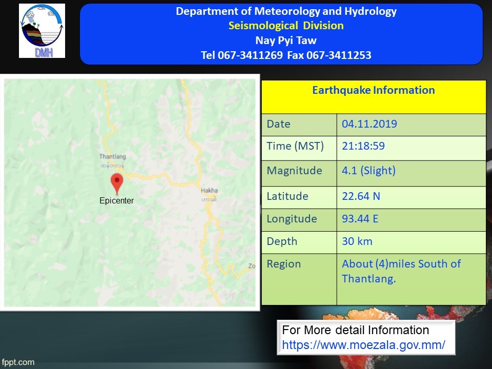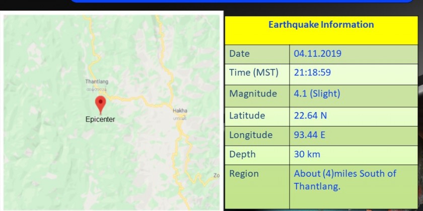 A slight earthquake with magnitude of (4.1) Richter Scale hit at about 4-mile South of Thanlang, at a depth of depth (30) kilometers about (9) miles west of Hakha seismological observatory.