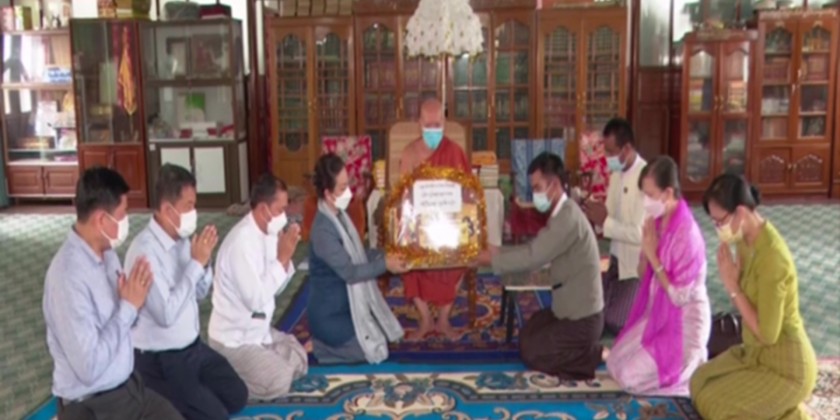 Union Minister for Social Welfare, Relief and Resettlement Dr Thet Thet Khine together with the Region Social Affairs Minister paid homage to Presiding Sayadaw of Gawthi Tarama Pati University Monastery, State Ovada Sariya Agga Maha Pandhita Buddhanta Pyin Nya Sami and donated robes and offertories to the Sayadaw on May 7.