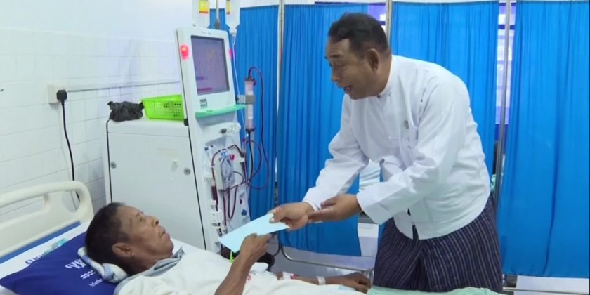 Afterwards, they attended the opening ceremony of the renovated out-patient department in Tamwe Township Labor Hospital, followed by ceremonial ribbon cut. They then inspected the medical treatment being provided in the hemodialysis room and offered cash assistance to the kidney dialysis patients. 4 blood purification machines have been installed in the hemodialysis room at the Labor Hospital in Yangon. Medical treatments are being provided to 8 insured workers per day free of charge with 7-day a week in Yangon and Mandalay.