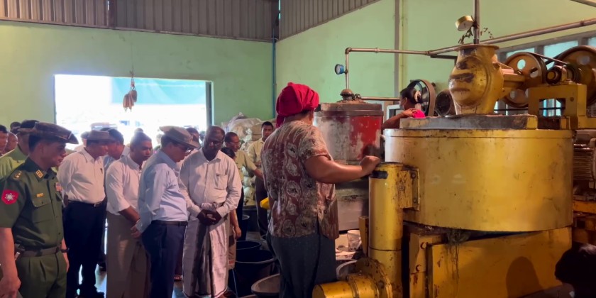 Then, the Chief Minister visited oil mill, rice mill and rice dryer in Buta Pine Ward, and gave instructions on producing animal feed and natural fertilizers using by-products from oil mill.