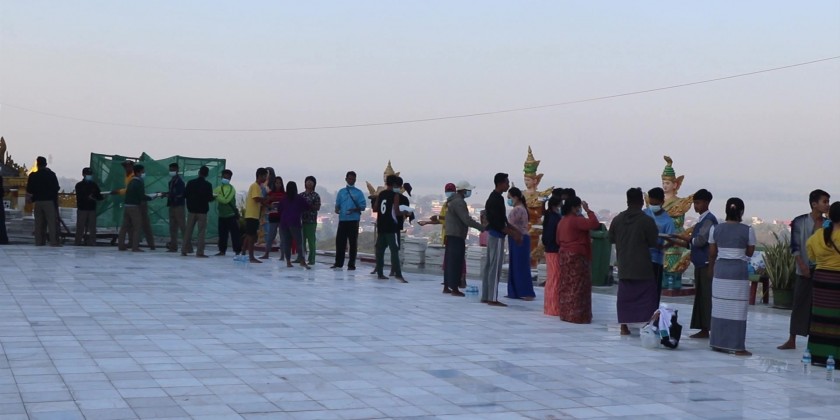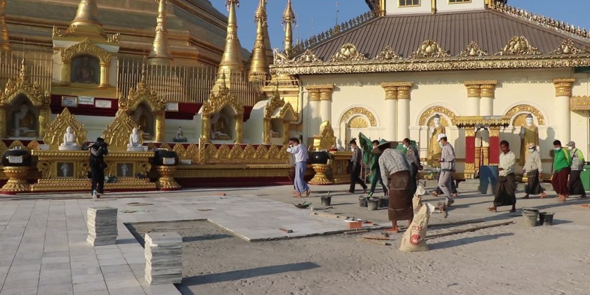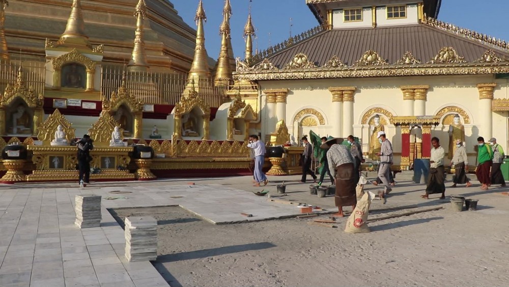 Mon State Chief Minister U Zaw Lin Tun visited the Landmark KyaikThanLan Pagoda of Mawlamyaing, and encouraged the departmental staff and people, volunteering for paving marble slabs on the pagoda platform.