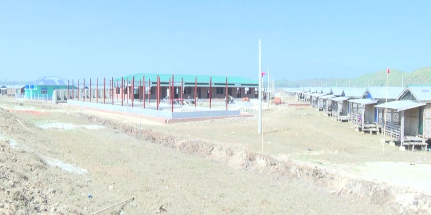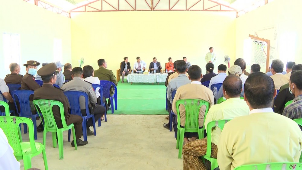 The Union Ministers and the Chief Minister then arrived at Kyauk Talone IDP camp in Kyauk Phyu and the Chairman of the District Administration Body and departmental officials reported on construction of housings, arrangements for water, electricity and sewage system, construction of clinic, earthen road and box culvert, construction of village community hall and schools.