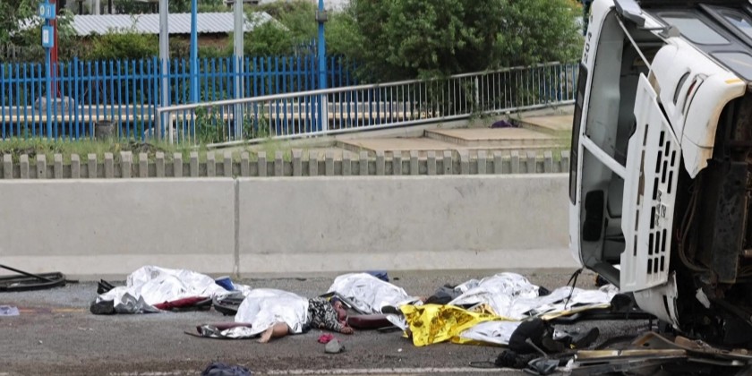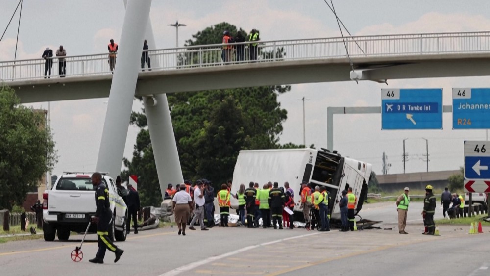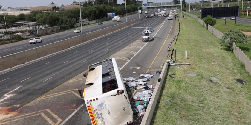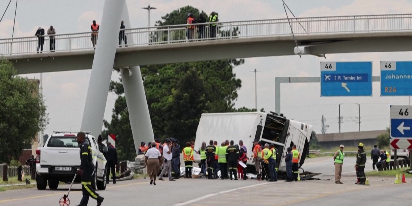 The bus was carrying more than 50 people to work when it crashed on a busy road near Johannesburg's O.R Tambo International Airport, officials said. Preliminary investigations showed that the vehicle swerved, rolled and landed facing the direction from which it came, the Road Traffic Management Corporation spokesman said. A survivor of the accident said that the bus appeared to be speeding.