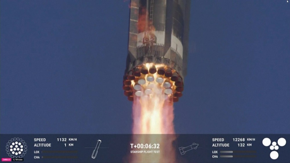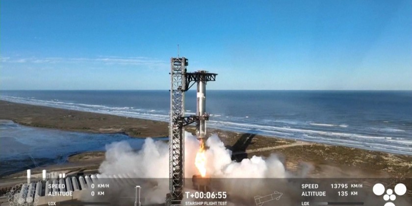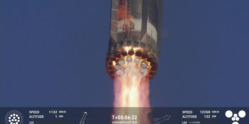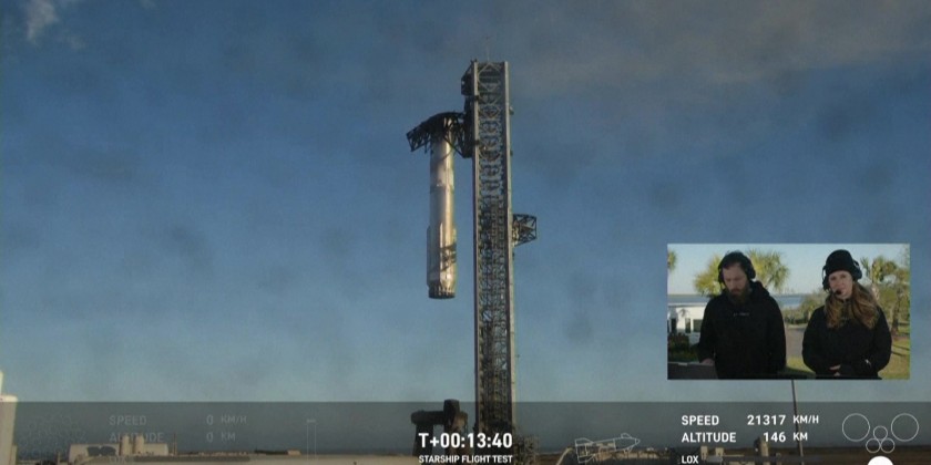 Shortly after the launch, Starship's Raptor engines ignited during hot-staging separation. The rocket's Super Heavy booster successfully returned to launch site, and repeated "chopsticks" catch -- catching the returning booster using mechanical "chopsticks," called "Mechazilla," on the launch tower.