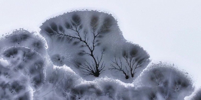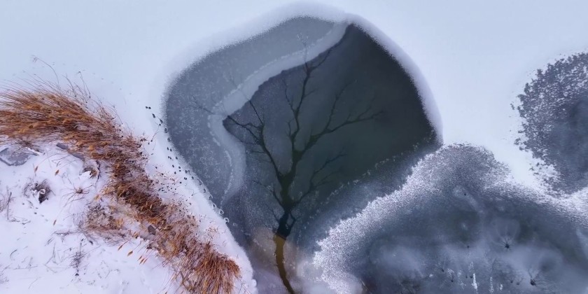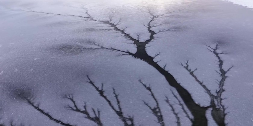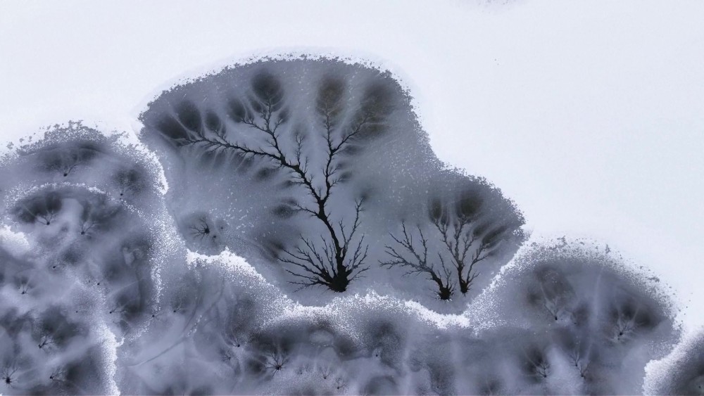A spell of cold has frozen a river in the Karatohai Wetland, northwest China, creating rare natural patterns that resemble tree branches on the water surface. As the river iced over, flowing water beneath the frozen surface carved intricate shapes that spread across the ice like branches stretching outwards.