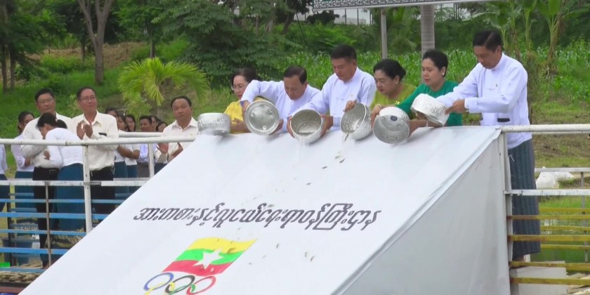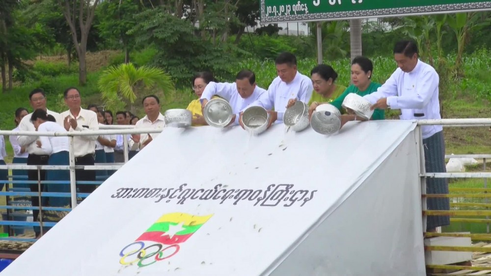 During ceremony of releasing fingerlings, Union Minister for Sports and Youth Affairs, U Min Thein Zan and wife, Deputy Ministers and wives and concerned officials released a total of 15,000 Hamilton Carp fingerlings into pond No.1 in Wunnatheikdi Stadium. Then, the monsoon tree planting ceremony was continued and the Union Minister, Deputy Ministers and officials planted a total of 1,300 Sein Ta Lone mango saplings at the designated places.