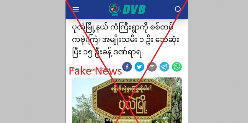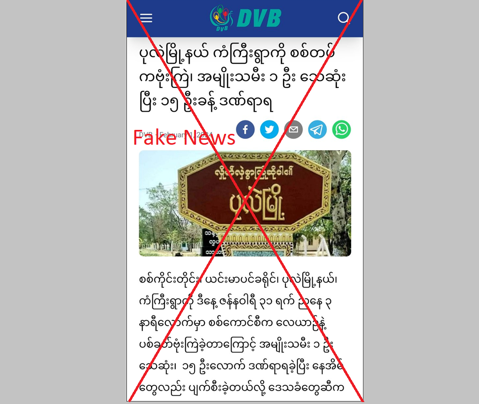 One of the illegal destructive media outlets DVB is spreading disinformation through social media platforms, alleging that a woman was killed and about 15 civilians were injured in Kangyi Village, Pearl Township of Sagaing Region due to airstrike launched by Tatmadaw on 31st January.