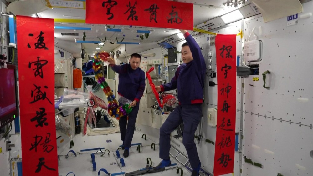 The Shenzhou-17 crew, who are on duty in outer space, celebrated their first Spring Festival in space by decorating the Tiangong space station. They couldn't return home for the Spring Festival, but they hosted their own New Year's party in orbit.