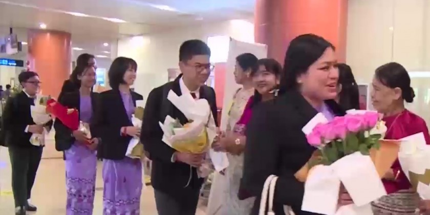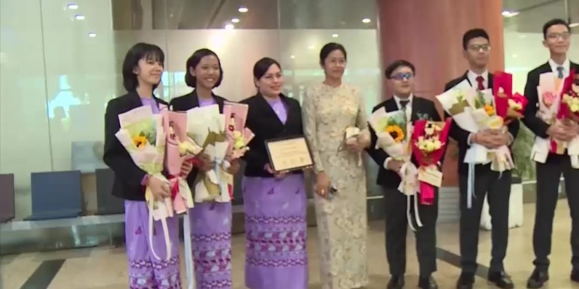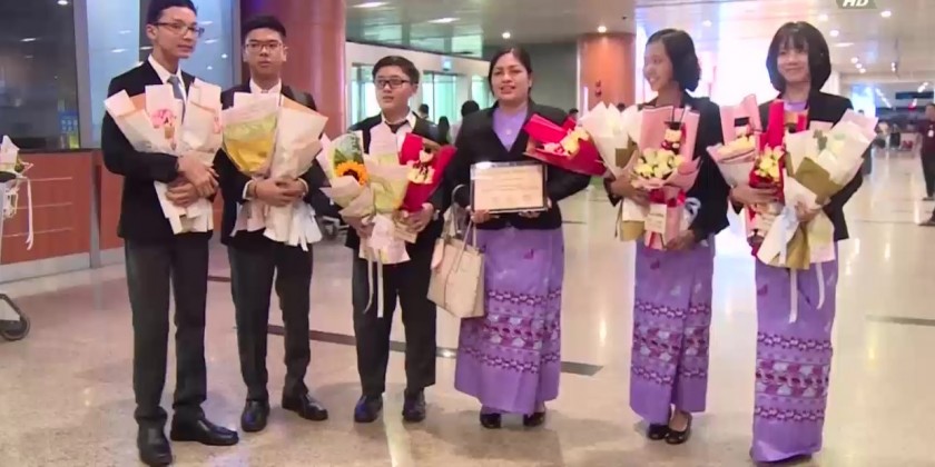 5 Students and a supervisor teacher from No.1, Basic Education High School Dagon who participated in the In-person Challenge of the SEAMEO-Singapore Students Challenge (SSSC) 2023 arrived back at the Yangon International Airport from Singapore on Tuesday evening and were welcomed by the parents and concerned officials.