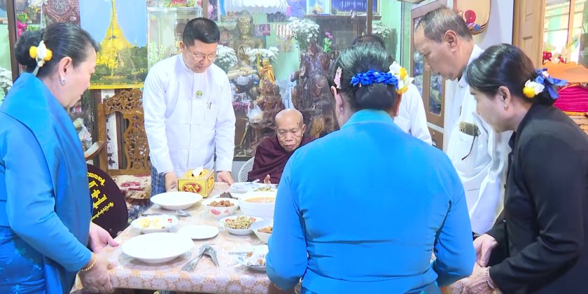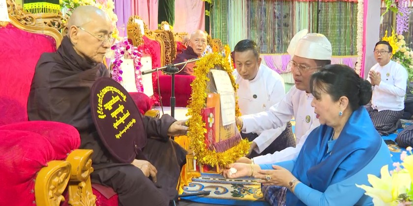 Afterwards, the Region Chief Minister and party attended the Higher Recognition and Honor Ceremony held at the Kabar Aye Pariyatti Monastery in Pathein. The Region Chief Minister and his wife conferred religious titles and paraphernalia, donation items and also offered ‘Soon’ (day meal) to the venerable Sayadaws, it’s reported.