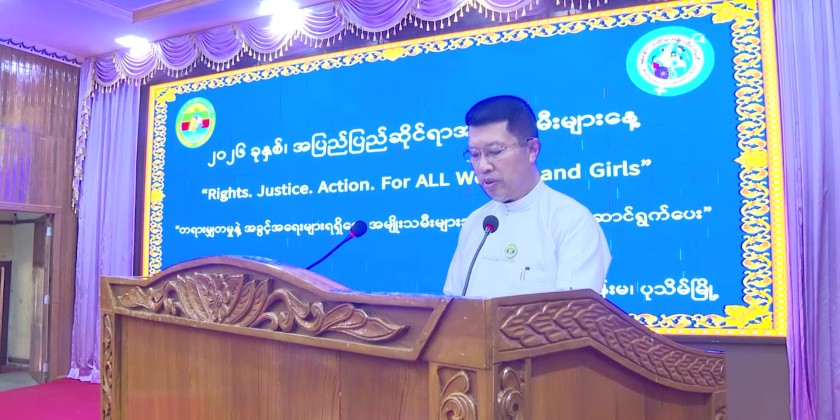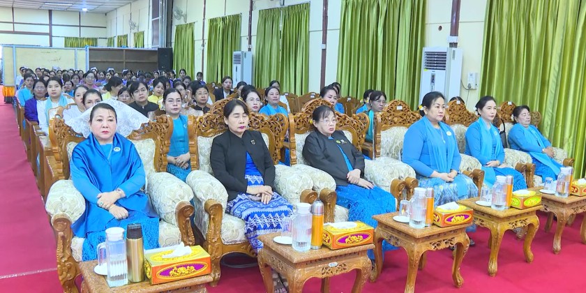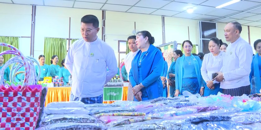 Subsequently, the Region Chief Minister and guests watched a video message from the United Nations Secretary-General and an educational documentary video sent by the Ministry of Social Welfare, Relief and Resettlement. They also visited and viewed a documentary photo gallery, handicraft products made by women, and craft items and products from home economics vocational training schools.
