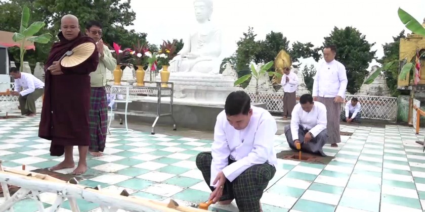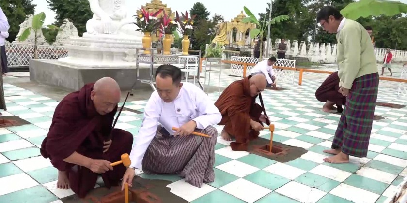 Organized by Rakhine State Government, the stake driving ceremony for the construction of two temples for the residing of Maravijaya Buddha image and Abhayarajamuni Buddha image at the precinct of Lawkananda pagoda in Sittwe was held in the morning on 14th August and attended by the OvadacariyaSayadawgyis and members of Sangha, State Chief Minister U Htein Lin, Chief Justice of State High Court, State Government Ministers, military officials from Sittwe station and invited guests.