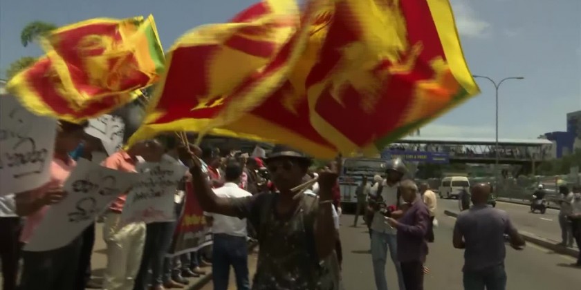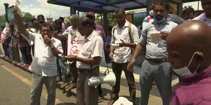 Dozens of protestors gathered on Monday at a railway station in Colombo to protest interim president RanilWickremesinghe.