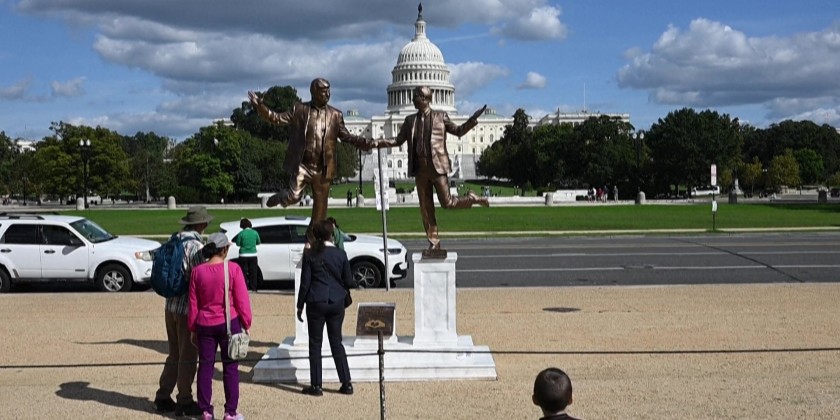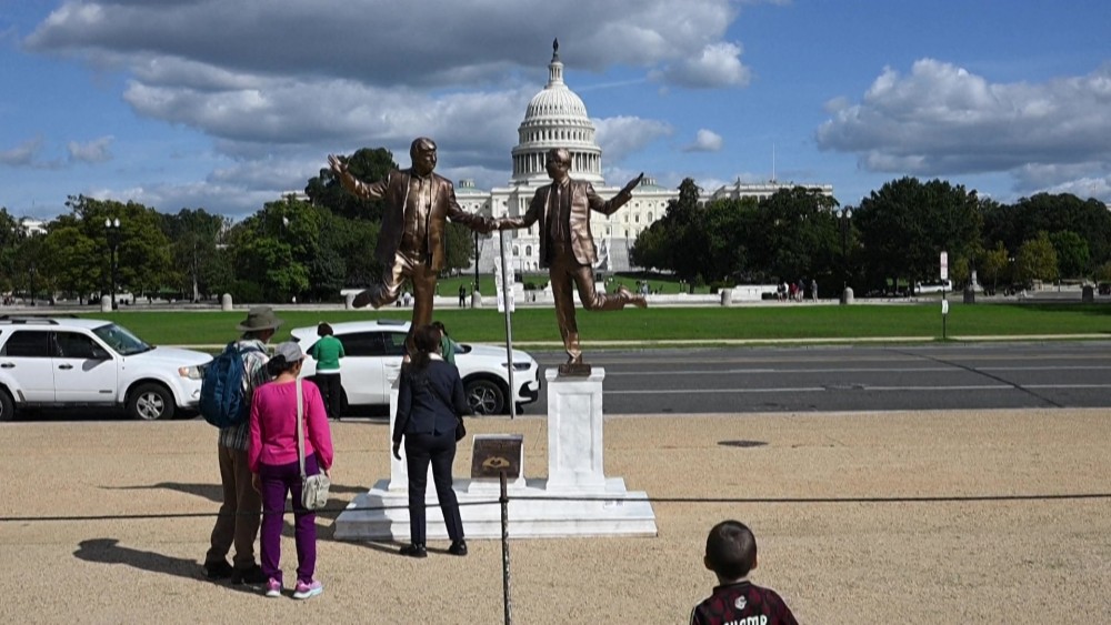 A statue depicting US President Donald Trump and Jeffrey Epstein holding hands is seen near the US Capitol. Titled "Best Friends Forever," by the anonymous art collective “The Secret Handshake,” the statue was installed near the US Capitol on September 23 and removed by the National Park Service the following day.
