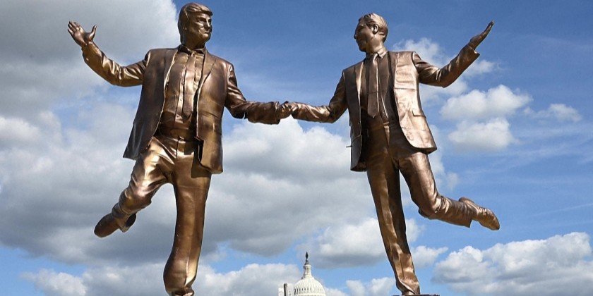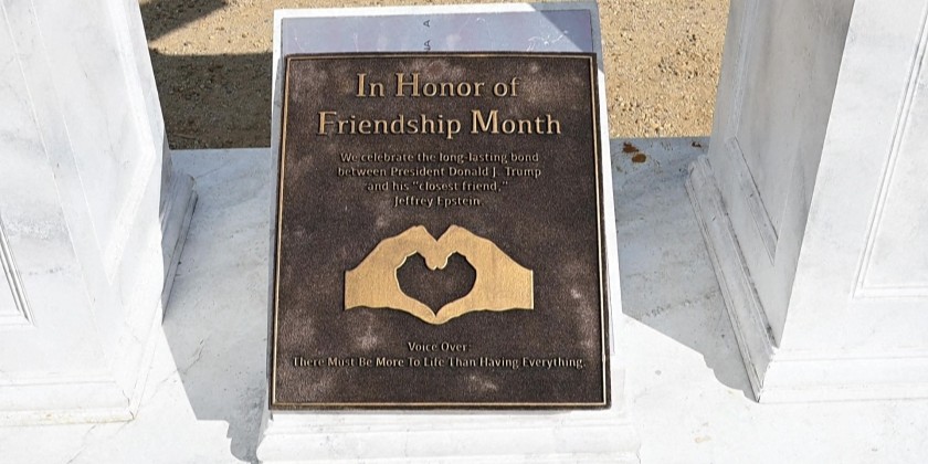 The sculpture has now mysteriously reappeared on October 2. A plaque below the statue reads: "In honour of Friendship Month, we celebrate the long-lasting bond between President Donald J. Trump and his 'closest friend,' Jeffrey Epstein.