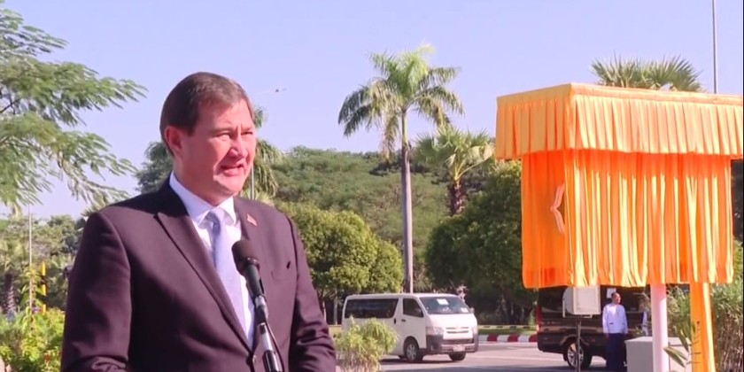 Then, the signboard of the road was unveiled, and the attendees strolled along the road. The newly named road connects Yazathingaha and Zabu Kyetthayay Roads. Along the 7,000 ft long Minsk Road are located the Myanma Economic Bank, private banks and Thiri Mingala Market.
