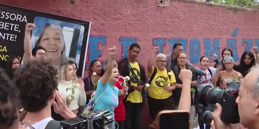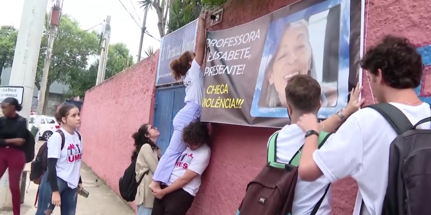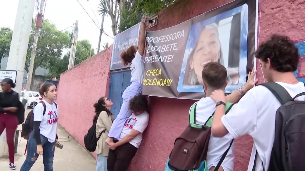 Students gathered in front of Sao Paulo's public School Thomazia Montoro on Tuesday, to pay homage to a teacher who was fatally stabbed by a 13-year-old student. The attacker entered the class on Monday wearing a skull mask and stabbed 71 year-old Elisabeth Tenreiro from behind, hitting her head and back.