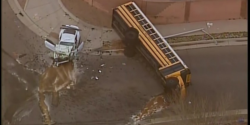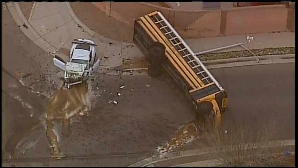 The driver of the sports car also was taken to the hospital after crash. The bus tipped over on its left side on a street near some houses. Albuquerque Public Schools officials said the bus was carrying students from George I. Sánchez Collaborative Community School. Police didn't immediately say how many students were injured or what led to the crash. They said the school's principal was calling parents so their children could be picked up and taken home.
