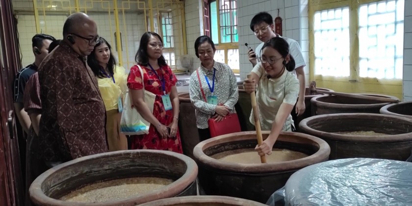 During the tour, she explored the Qiao family's significant role in China's trade, banking, and restoration, observed modern production methods at Honghai Glass Industry, and examined vinegar production at Donghu Vinegar Park, including innovative uses in snacks.