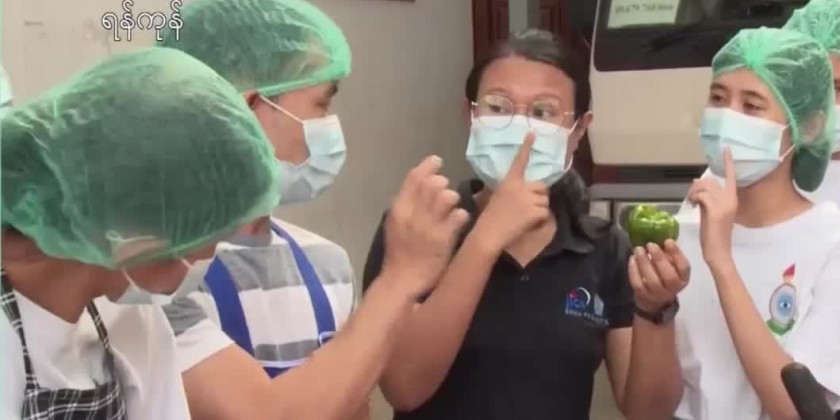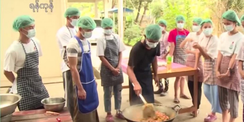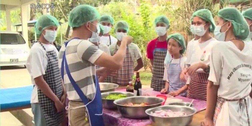 Zar Zar Soe, In charge, cooking course, said " First, we teach them through signs. We peel the onions easily at home but here we teach how to peel them systematically so that your hands don't bleed. Pork kebab, chicken kebab, sweet and sour pork, Scrape fish ball, fish curry, Roselle leaf syrup, lettuce salad and so on will be taught at the course."