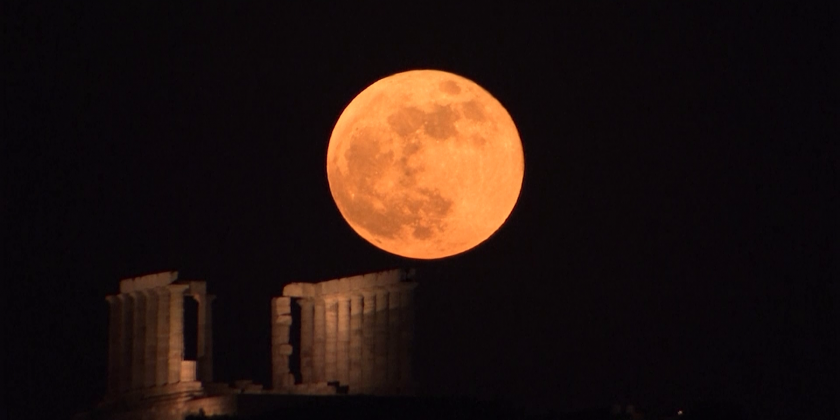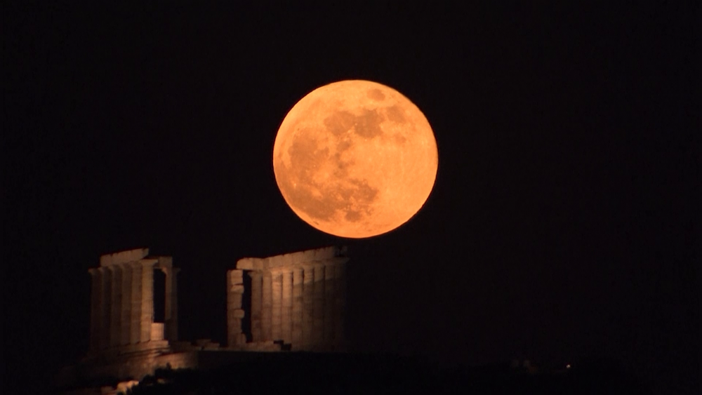 In Greece on Wednesday, the supermoon was seen rising behind the columns of the ancient marble Temple of Poseidon at Cape Sounion, south of Athens. The reddish-orange color of the super "blood" moon is the result of all the sunrises and sunsets in Earth's atmosphere projected onto the surface of the eclipsed moon. The moon was more than 220,000 miles away at its fullest. It was this proximity, combined with a full moon, that qualified it as a supermoon, making it appear slightly bigger and more brilliant in the sky. More lunar shows are coming. On Nov. 19, there will be a near total eclipse where the moon dims but doesn't turn red. The next total lunar eclipse will be May 2022. The last one was January 2019.