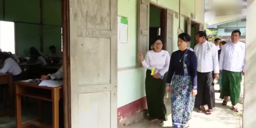 Accompanied by Yangon Region Chief Minister and concerned officials, Union Minister for Education Dr. Chaw Chaw Sein on Friday, visited No.1 Basic Education High School in Hmawbi Township to encourage the students who were sitting Mathematic subject for 2026 Academic Year matriculation examination.