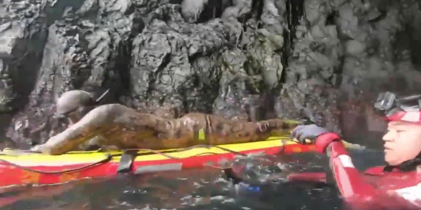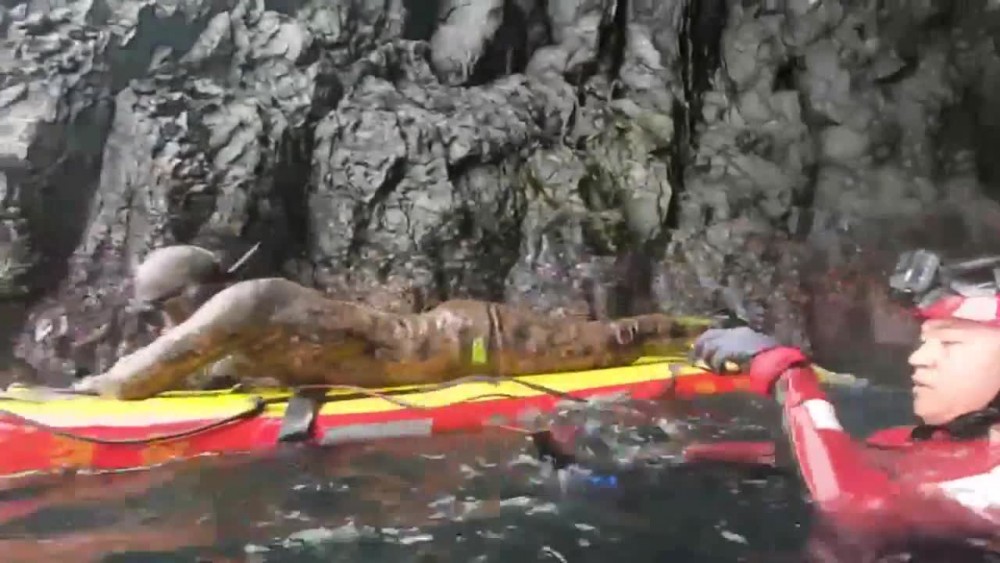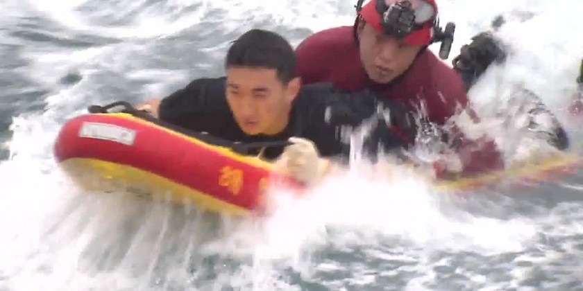 A man who has fallen into water while fishing waves his hand to notify rescue workers of his location. A Coast Guard official gets on a board and sets out to rescue him. It takes less than 30 seconds to cover more than 100meter.