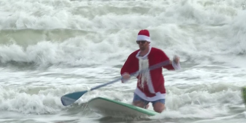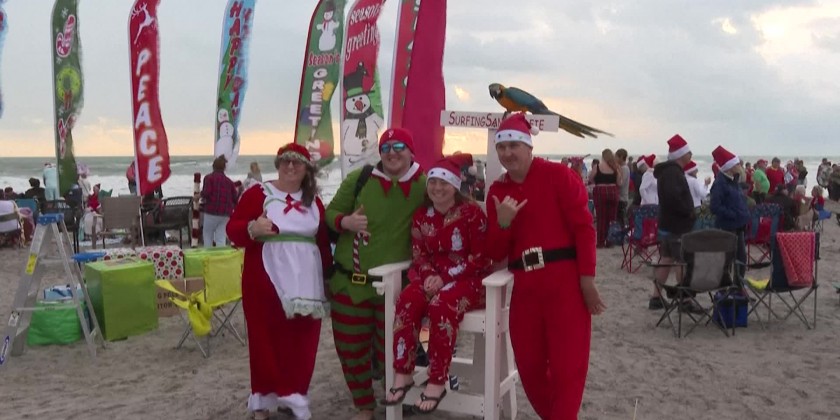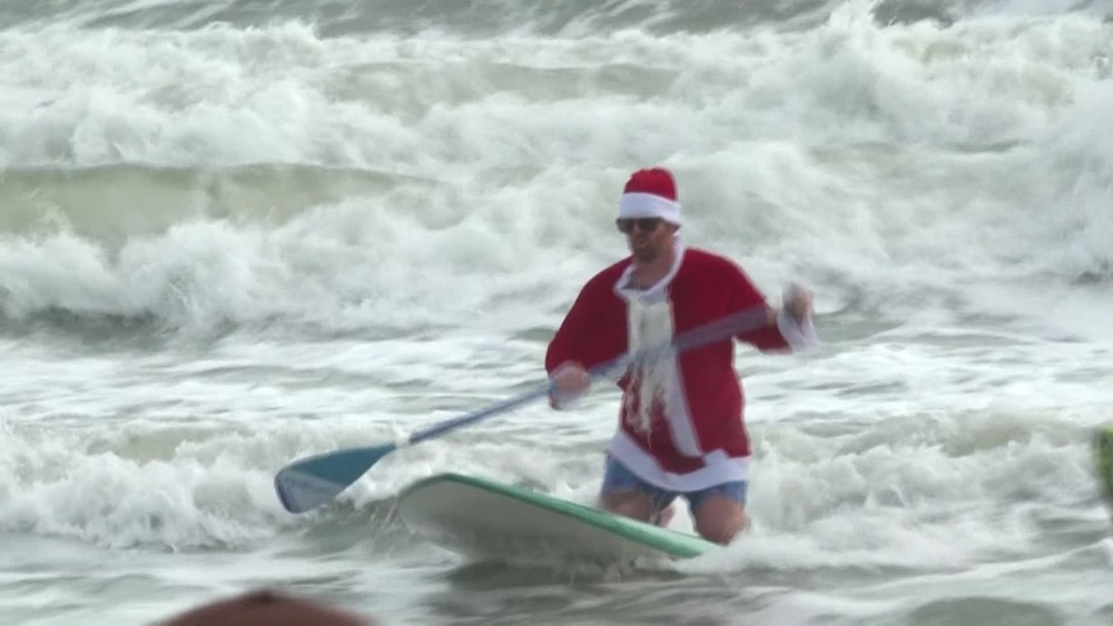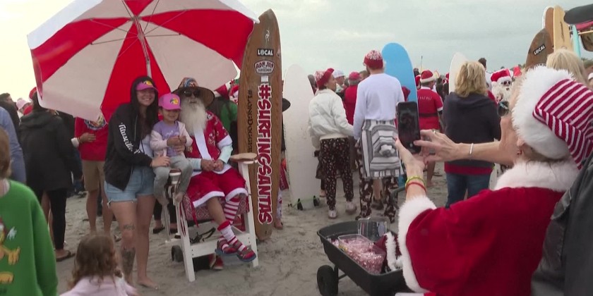 The annual “Surfing Santas” celebration takes place at the Cocoa Beach in Florida on Monday morning with a thousands of adults and children alike dressed as St Nick, elves and reindeer.