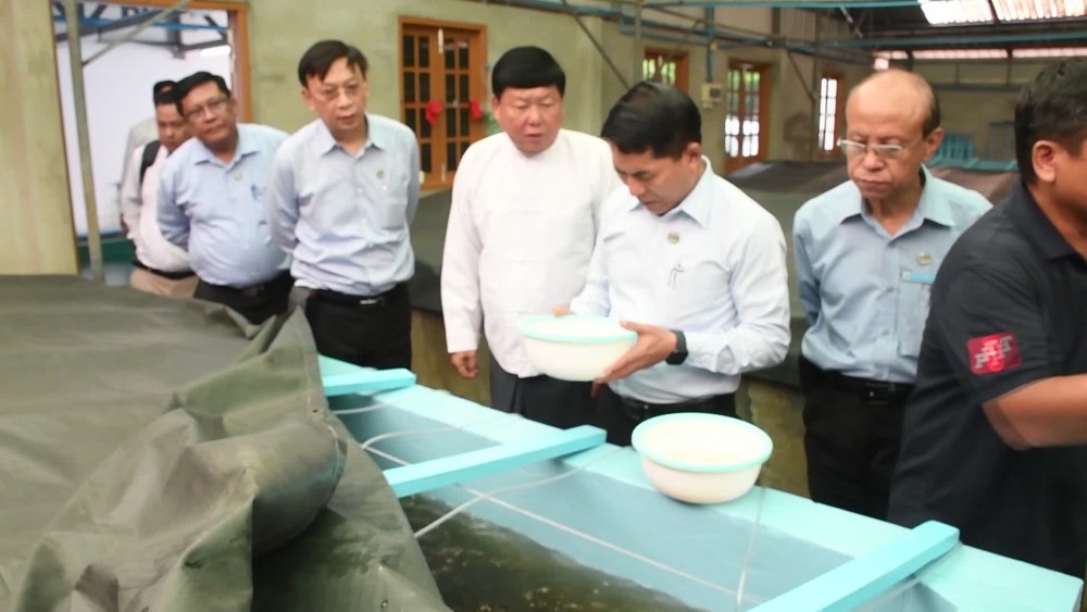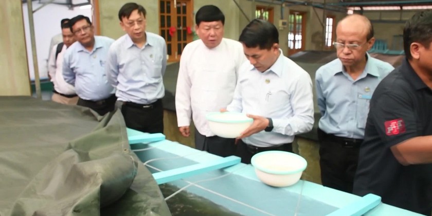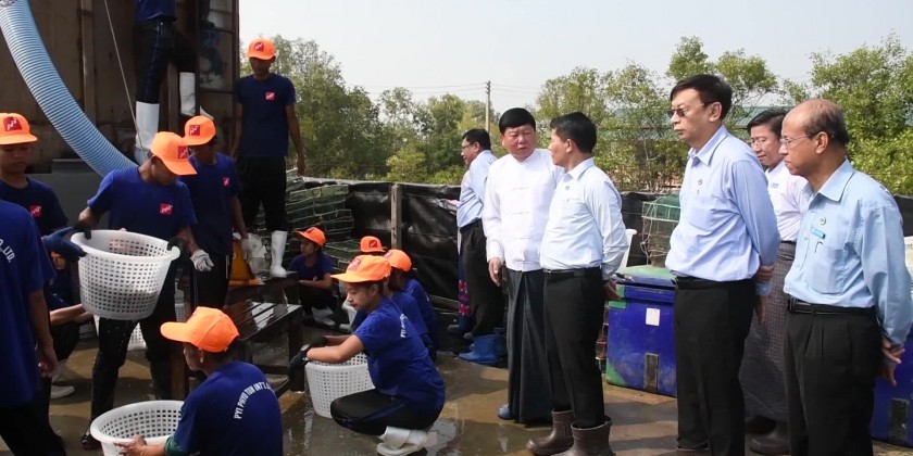 On 15th March, Union Minister for Agriculture, Livestock and Irrigation U Min Naung, together with Chief Minister U Myat Ko and officials, visited Pahtaw Village in Kyunsu Township and observed the breeding of prawns at Pyay Phyo Tun International Company.