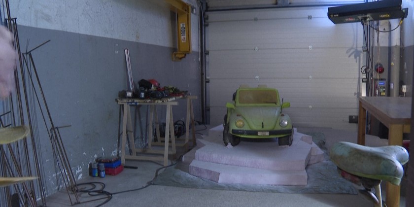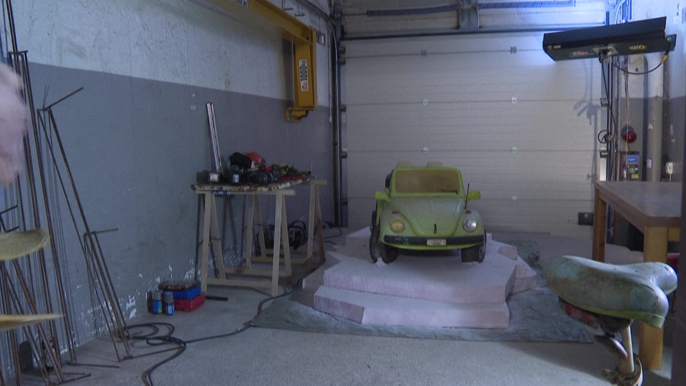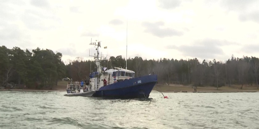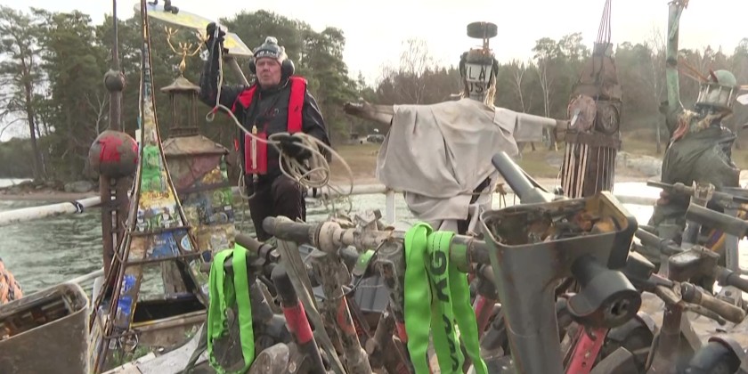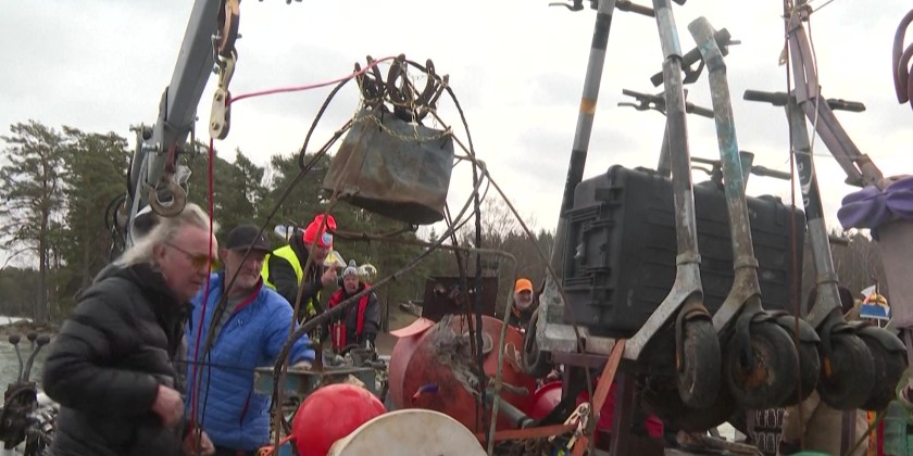Artworks inspired by famous landmarks from all over the world are lowered into green murky waters outside of Stockholm.