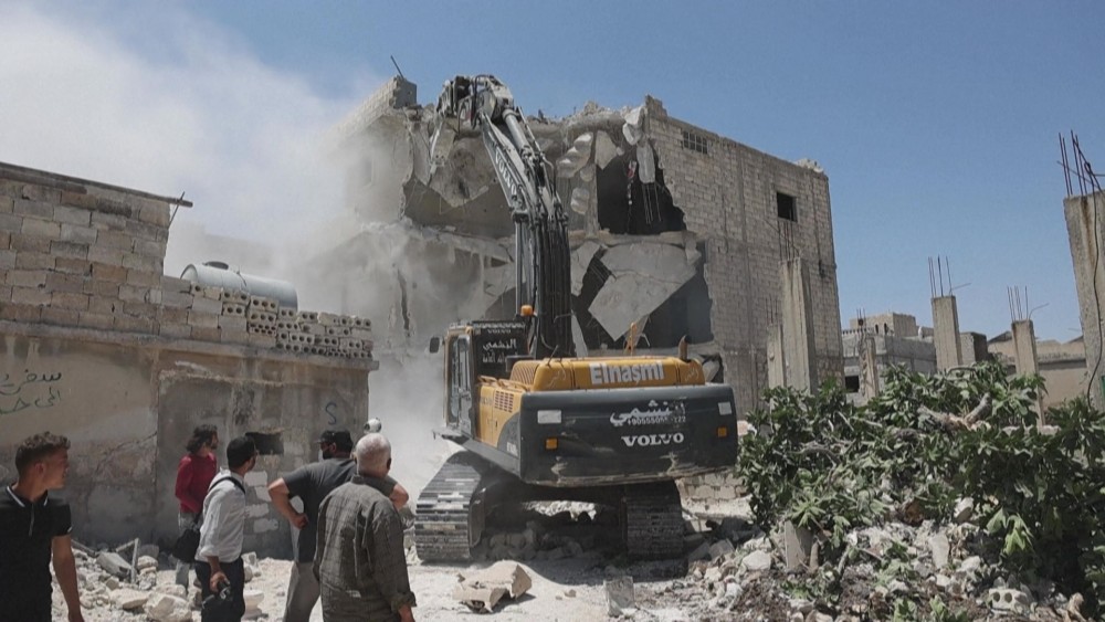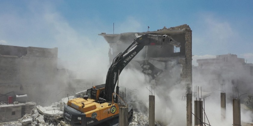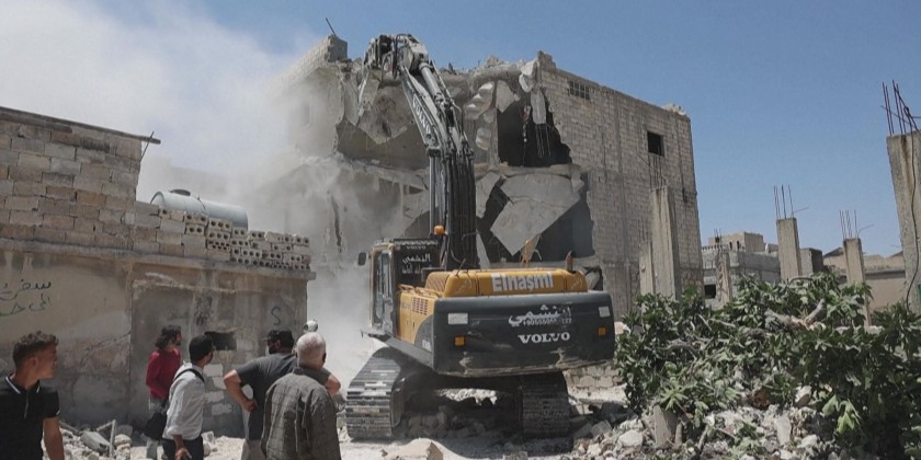 Members of Syria's civil defence, also known as the White Helmets, use an excavator to demolish buildings damaged in the February 6 earthquake, in the Syrian towns of Atareb and Armanaz.
