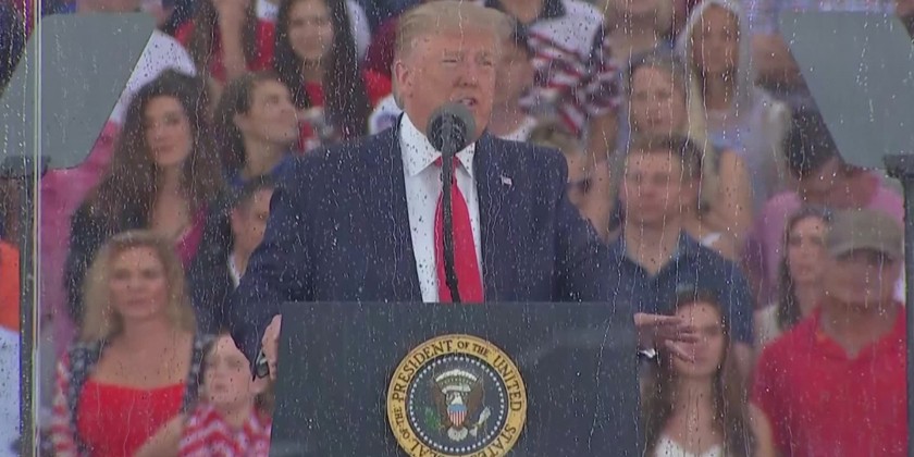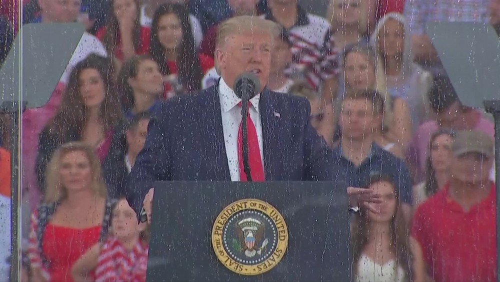 "Our nation is stronger today than it ever was before. It is its strongest now," Trump said. A flyover by Air Force One occurred unannounced and without fanfare. But a low and spectacular flyover by six F-18s known as the "Blue Angels" at the conclusion of Trump's speech thrilled the crowd.