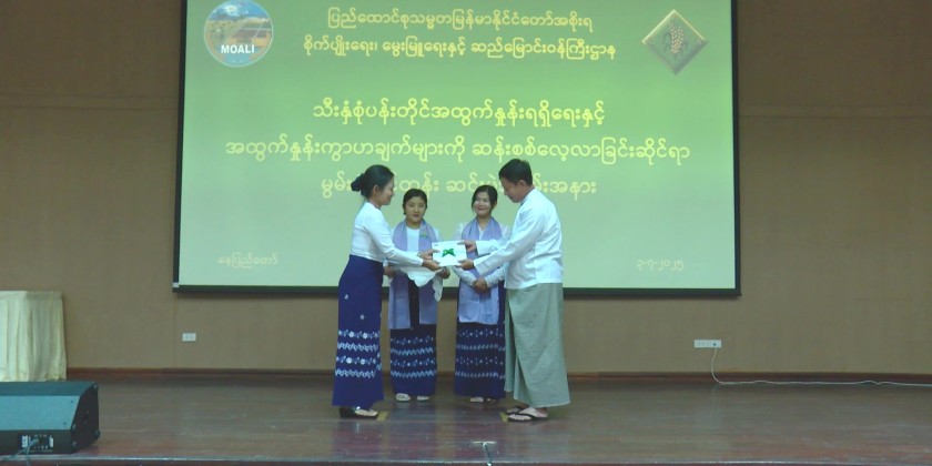 Deputy Minister for Agriculture, Livestock and Irrigation Dr. Tin Htut attended and encouraged the trainees. As part of the program, trainees conducted field surveys with 65 farmers across eight townships in Nay Pyi Taw. Instructors from the Yezin Agricultural University taught trainees how to fill out survey forms and provided guidance on necessary data.