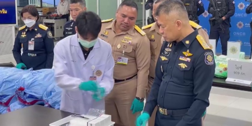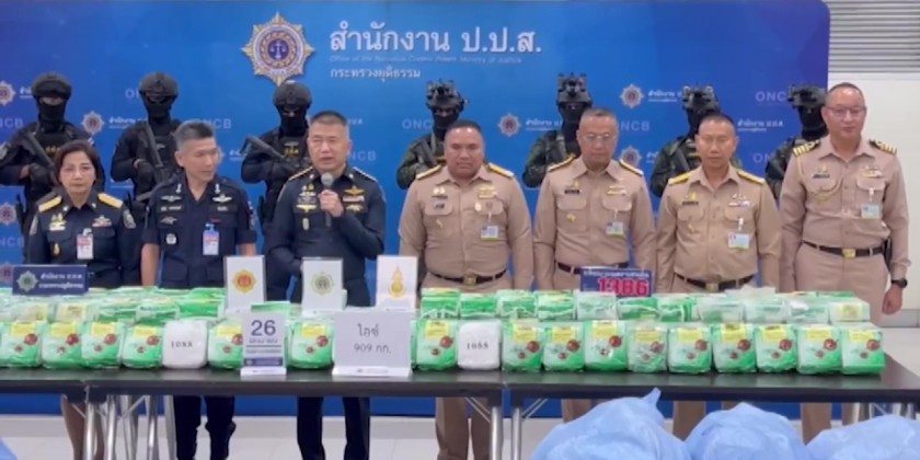 Thai drug enforcement officials and Navy SEALs seized 909kg of crystal methamphetamine, or Ice, on Tuesday night from a fishing vessel in the Gulf of Thailand, about 20 nautical miles from Samed Island in the eastern province of Rayong.
